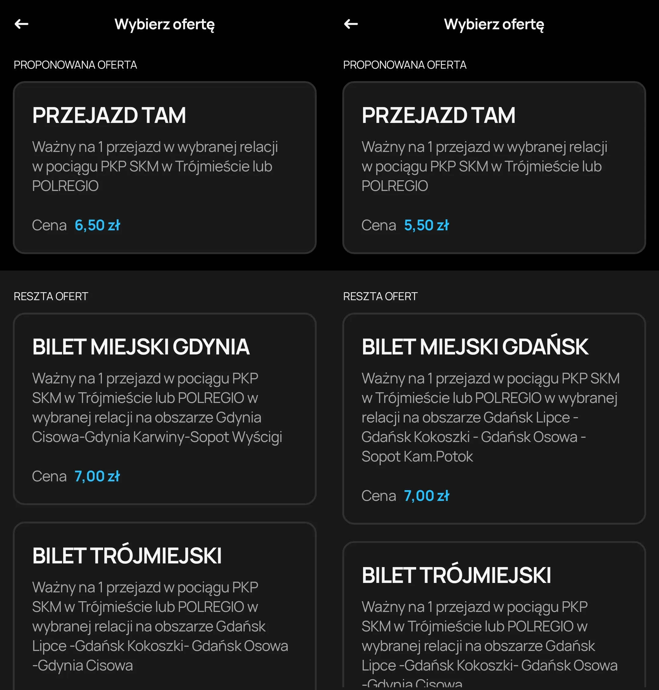 Trimiestis, skirtingai nuo Lenkijos sostinės, metro neturi, tad SKM traukiniai ten atlieka itin svarbią funkciją, tačiau kadangi ne visiems Gdansko gyventojams reikia į Gdynę, versti juos permokėti būtų tiesiog nelogiška. Pagal pasirinktas stotis, sistema pasiūlys bilietus konkrečiam maršrutui, Trimiesčio arba Gdansko bilietą ir t. t. Kainos atitinkamai taip pat skirsis.